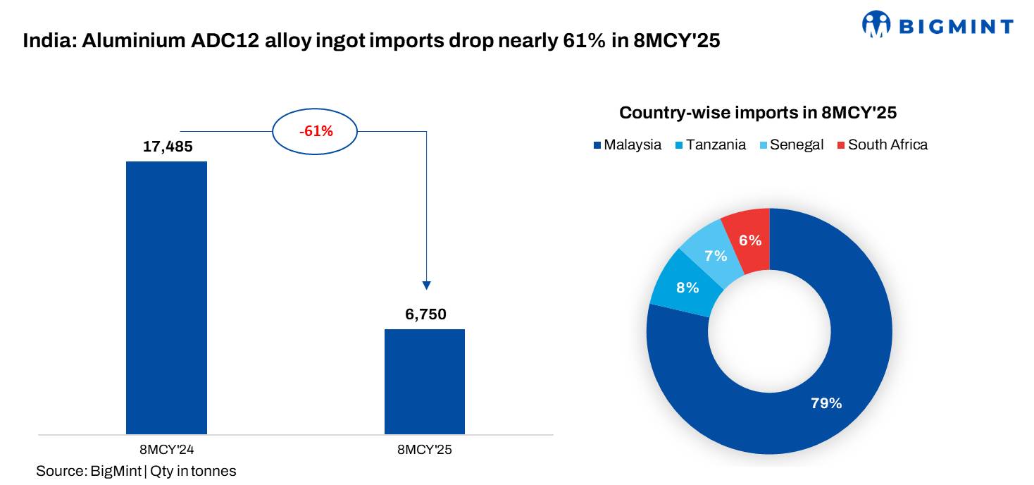 India's ADC12 alloy market continued to witness a sharp contraction in imports during the first eight months of 2025 (8MCY'25), with inbound volumes falling 61% year-on-year. Total ADC12 imports stood at 6,750 t, down significantly from 17,485 tin 8MCY'24.