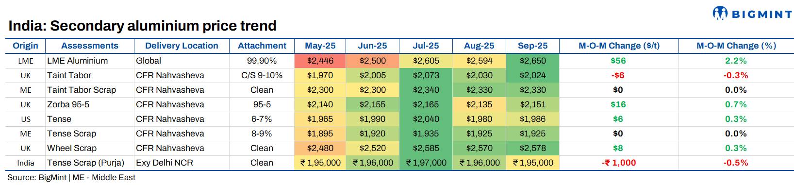 India's secondary aluminium market saw a modest decline in September 2025, following a similar dip in August, after continuous gains in alloy ingot prices during the first half of the year. The drop in prices came as a result of a slight drop in domestic scrap prices amid improved availability.