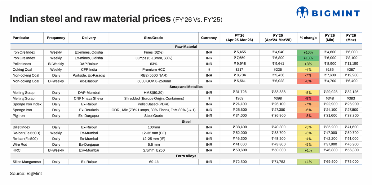 Sponge iron: Average sponge iron prices in FY'26 declined by 7% y-o-y due to the decline in semis, scrap and steel prices. Non-coking coal prices also edged down on-year. Although volatile scrap prices swung the balance in favour of sponge, soft steel prices as well as higher domestic production and supplies weighed on prices.