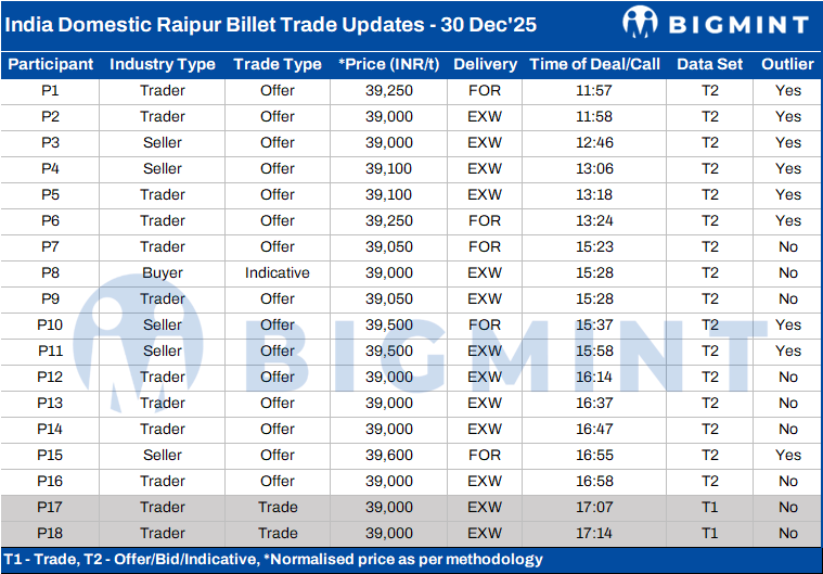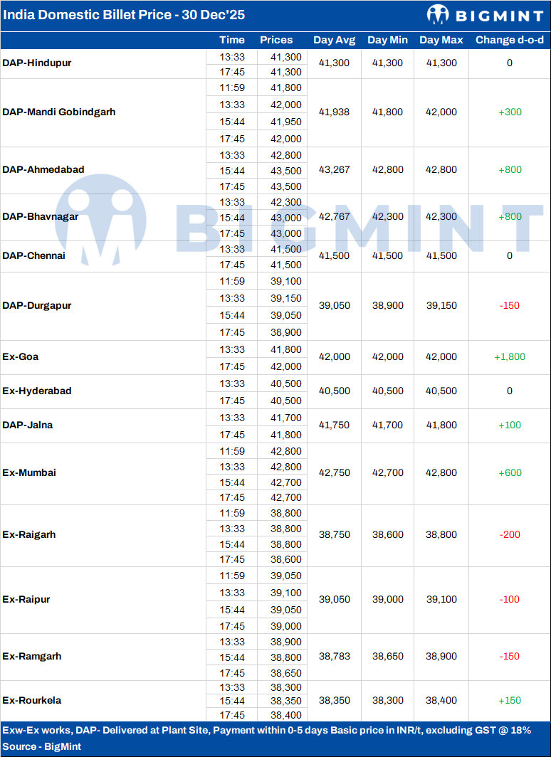 BigMint's billet index eased by INR 100/tonne (t) d-o-d to INR 39,000/t exw-Raipur on 30 December 2025, as market activity softened due to restrained procurement and subdued enquiries across the semi-finished and finished steel segments. Buyers remained cautious, limiting purchases to immediate requirements while awaiting clearer market direction.