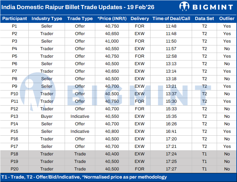 BigMint's billet index declined by INR 300/t day-on-day to INR 40,500/t exw-Raipur on 19 February 2026, marking an approximate 3% drop from last week's closing level, as weakening finished steel demand and limited semi-finished bookings exerted sustained pressure on prices.