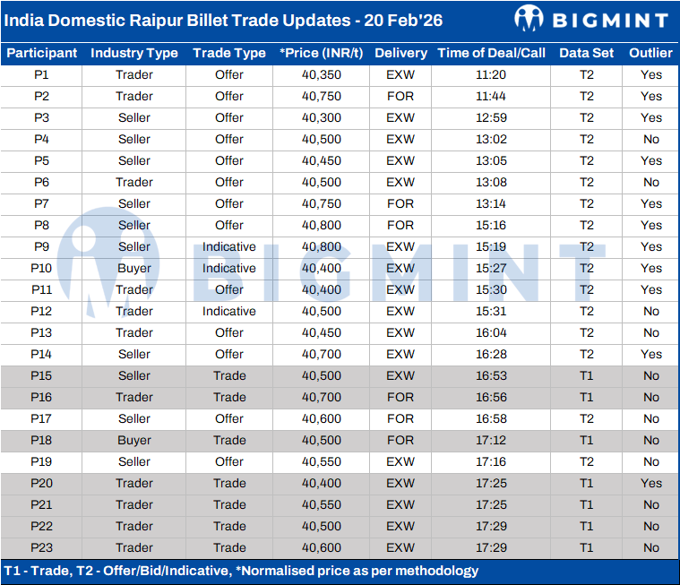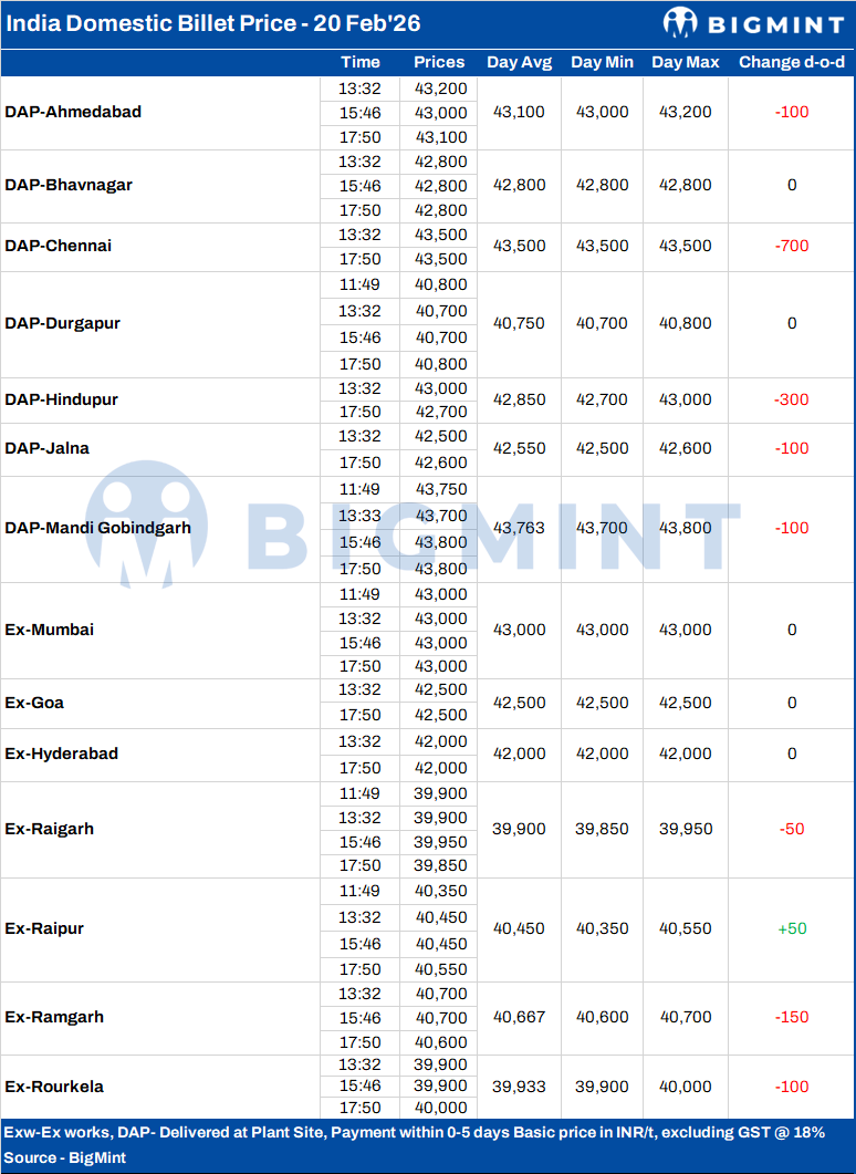 BigMint's billet index rose by INR 50/t day-on-day to INR 40,550/t exw-Raipur on 20 February, recovering from intraday lows of INR 40,300-40,400/t, as improved bookings lent modest support to the semi-finished steel segment.