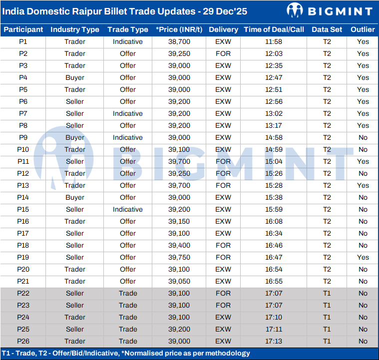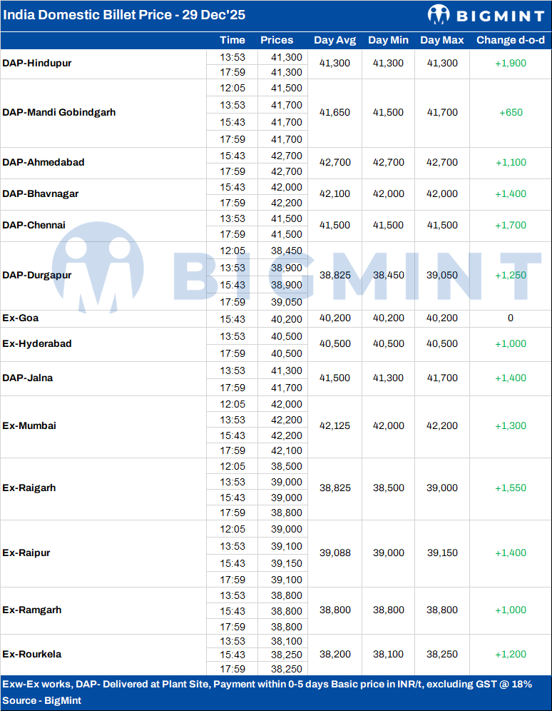 BigMint's billet index increased sharply by INR 1,400/tonne (t) d-o-d to INR 39,100/t exw-Raipur on 29 December 2025 to its highest level in over seven months, last seen in May 2025. The surge was supported by improved buying activity and stronger billet demand from neighbouring regional markets, which pushed spot offers higher.