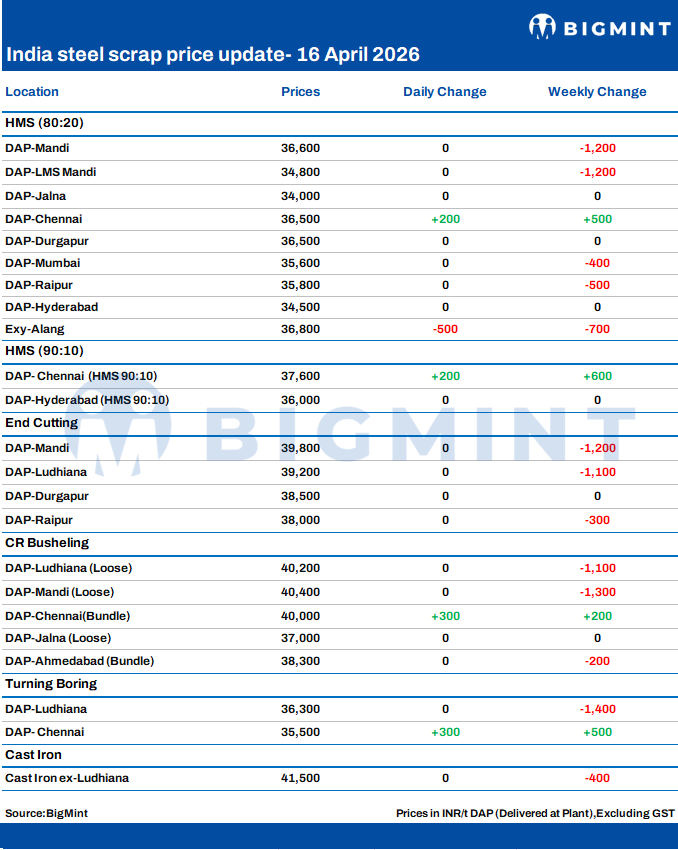 BigMint's domestic end-cutting scrap index, tracking the Mandi Gobindgarh market, remained unchanged d-o-d at INR 39,800/tonne (t) DAP on 16 April 2026. In Mandi Gobindgarh, local mills procured scrap at moderate levels this week. Supply from neighbouring regions stayed steady, while imported scrap buyers continued favouring domestic material due to better price viability.