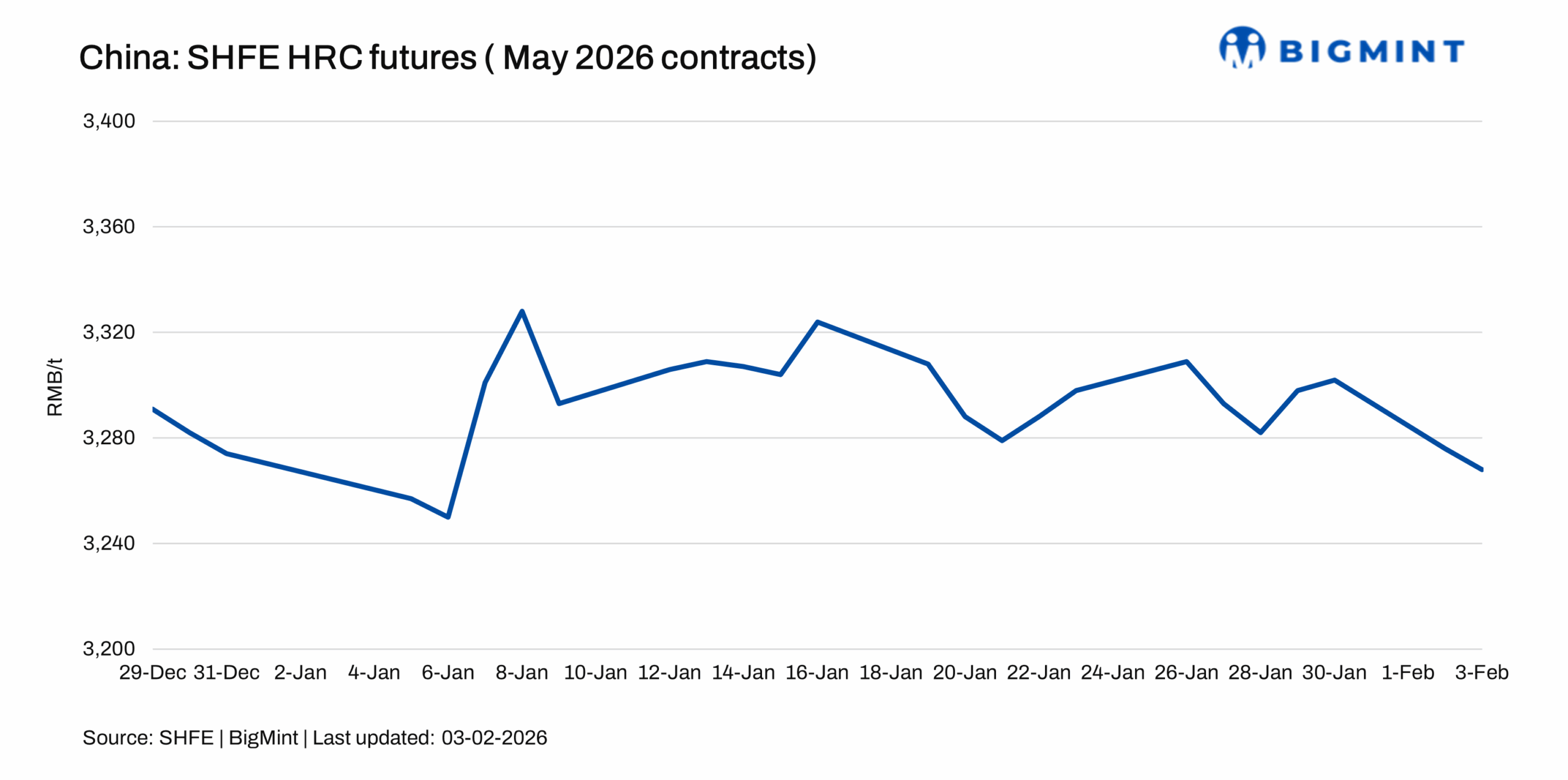 China's HRC export offers to the Middle East remained stable w-o-w at $500/t CFR UAE amid sluggish activity ahead of the Lunar New Year. Moreover, a deal of around 30,000 t was heard concluded at similar levels for March 2026 shipments. May 2026 HRC contracts on the Shanghai Futures Exchange (SHFE) declined by RMB 25/t ($4/t) w-ow to RMB 3,268/t ($471/t) on 3 February from RMB 3,293/t ($475/t) on 27 January 2026.