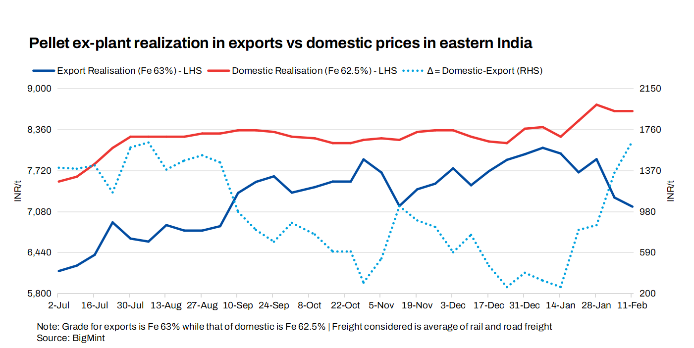 BigMint's India pellet (Fe 63%, 3-3.5% Al) export index fell by $2/t w-o-w to $98/t FOB east coast on 11 February 2026. The index hit a five-month low as similar levels were seen in early September 2025. However, recently a deal also got concluded from the east-coast amid lower export price realization and bid-offer disparity.