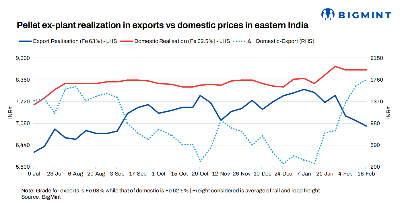 BigMint's India pellet (Fe 63%, 3-3.5% Al) export index fell by $3/tonne (t) w-o-w to $95/t FOB east coast on 18 February 2026.