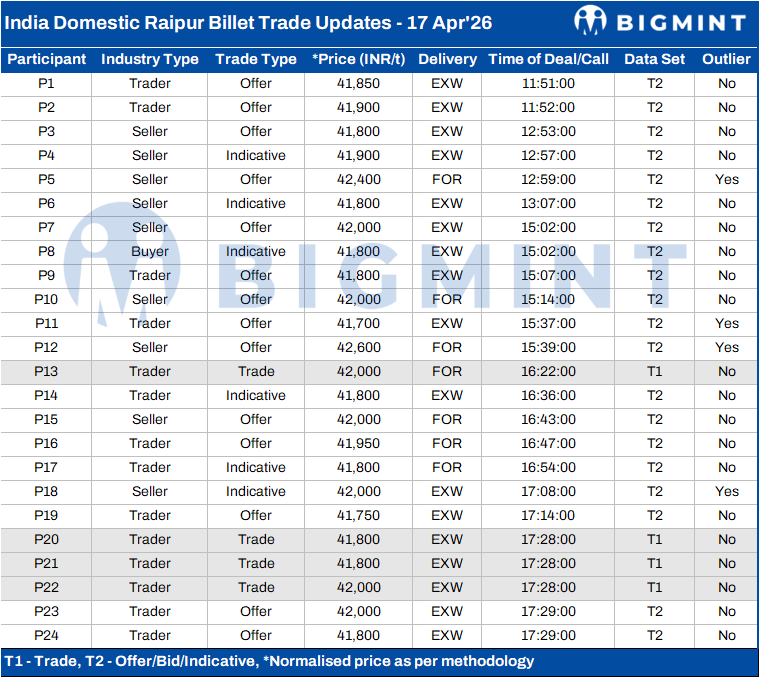 BigMint's billet index in Raipur declined further by INR 200/t d-o-d to INR 41,900/t exw on 17 April 2026, as weak demand and continued market uncertainty weighed on trading.