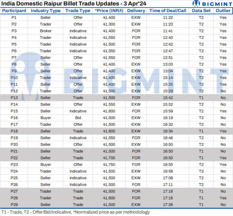 The final price for billet exw Raipur was at INR 41,505/t, rounded to INR 41,500/t exw.