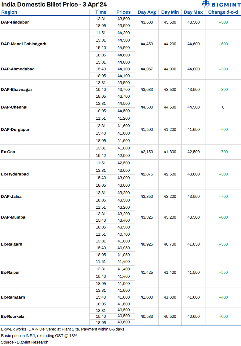 BigMint's billet index continued to increase further by INR 550/t, reaching INR 41,500/t exw-Raipur on 3 April, 2024.
