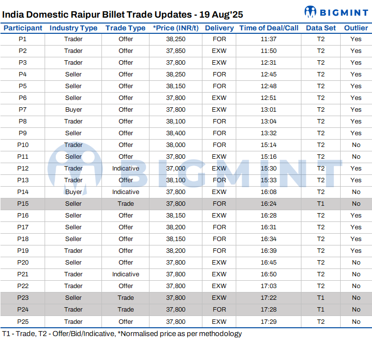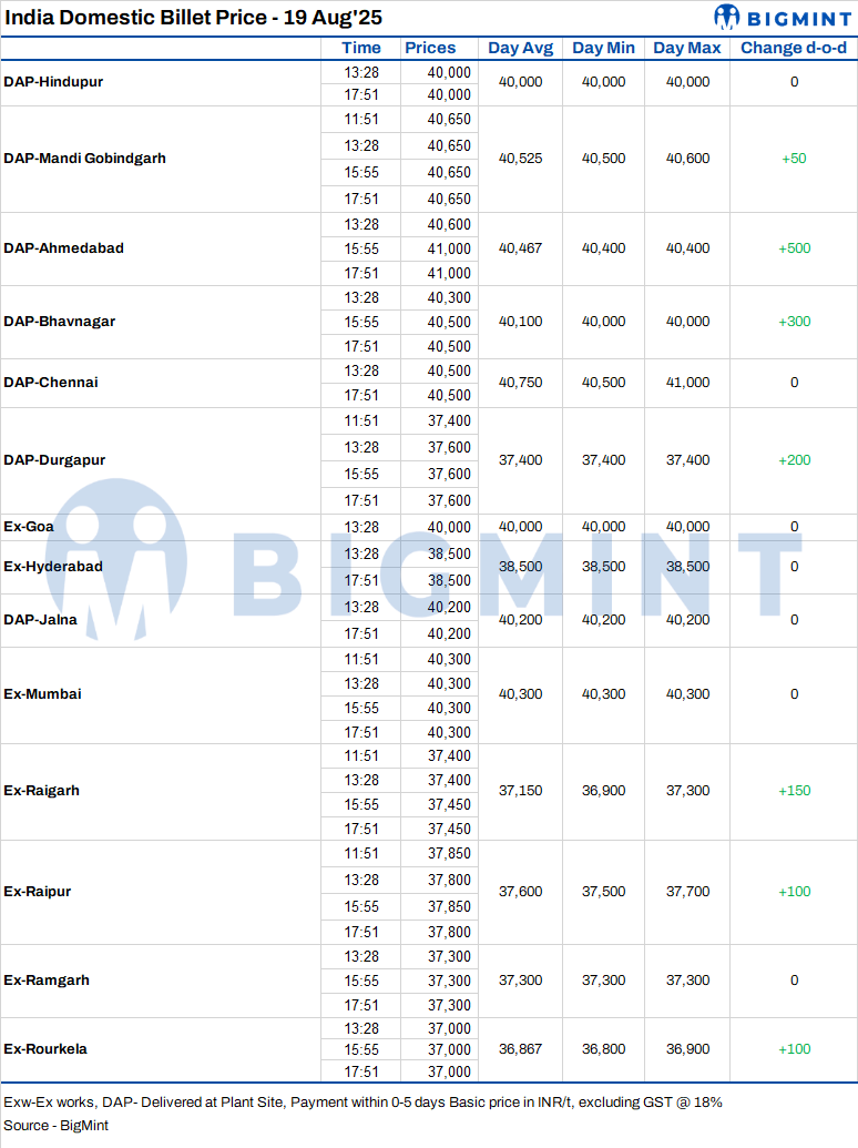 BigMint's billet index rose by INR 100/tonne (t) day-on-day, settling at INR 37,800/t exw-Raipur on 19 August 2025, supported by positive cues from neighbouring steel markets and carry-over momentum from the previous session.