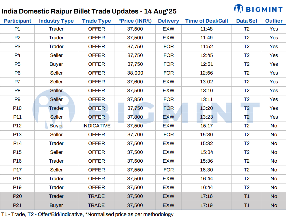 BigMint's billet index slipped INR 50/t d-o-d, settling at INR 37,500/t exw-Raipur, as subdued demand and weak enquiry levels kept trading activity limited throughout the day.