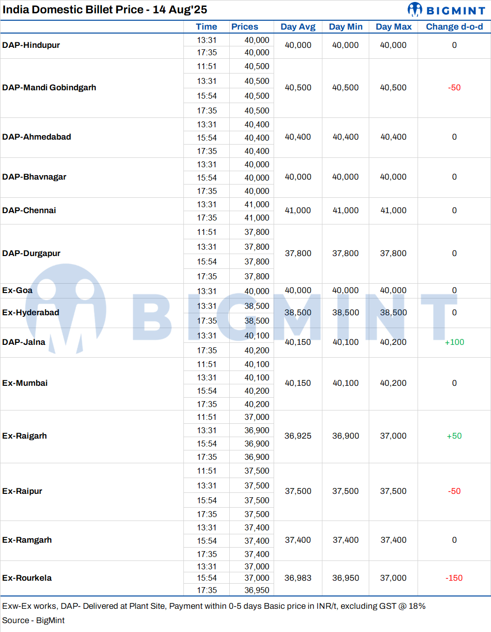 The final price of billets was INR 37,515/t exw-Raipur, rounded off to INR 37,500/t exw.