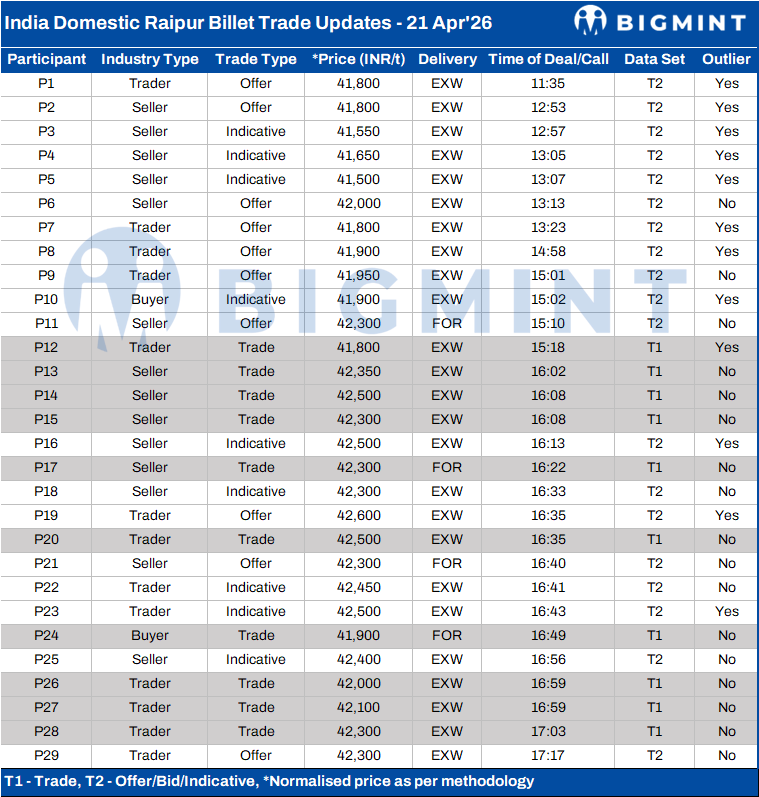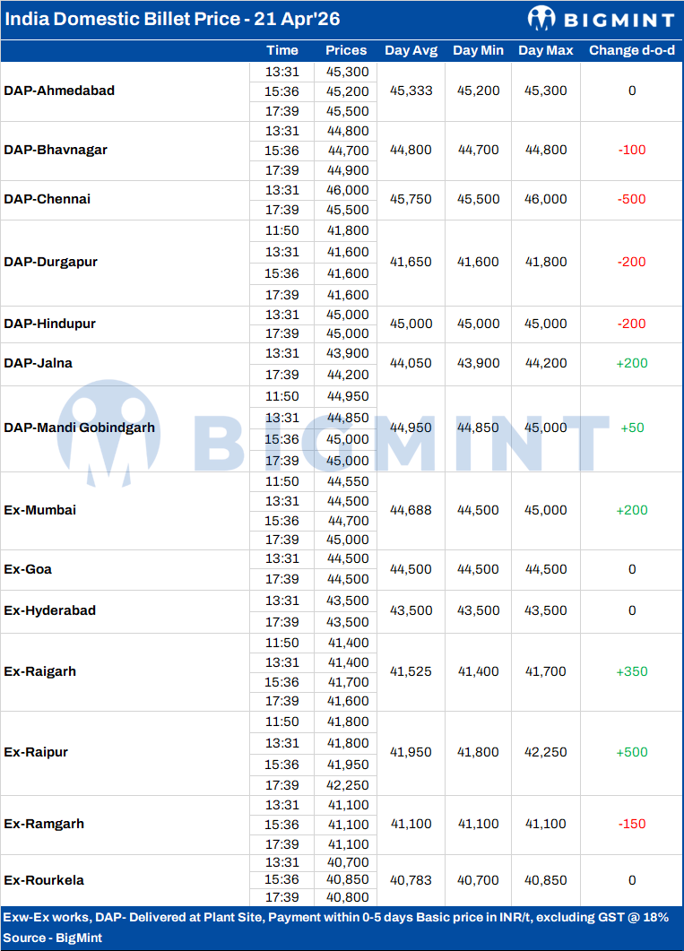 BigMint's billet index in Raipur rose sharply by INR 500/t day-on-day to INR 42,250/t ex-works on 21 April 2026, supported by improved buying activity and stronger demand from neighbouring regional markets.
