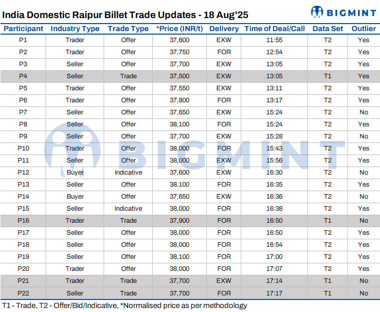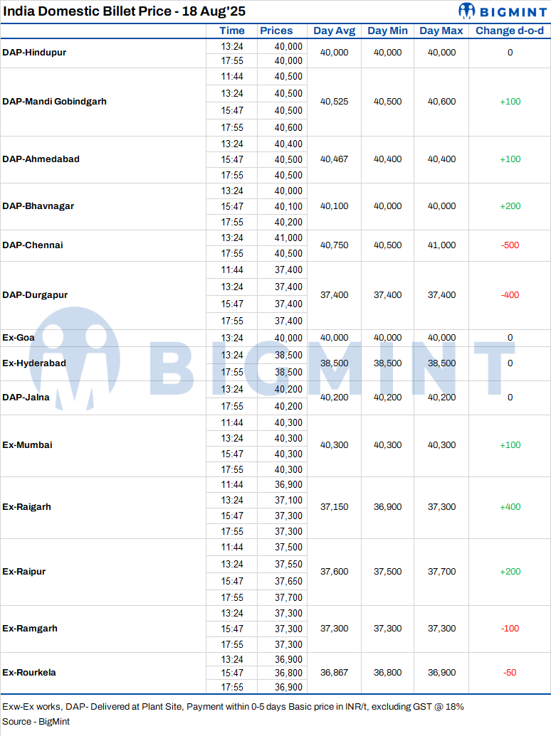 BigMint's billet index gained INR 200/t d-o-d, settling at INR 37,700/t exw-Raipur on 18 August 2025 supported by improved semi-finished steel demand, recovery in finished steel prices, and price support from neighbouring regions.