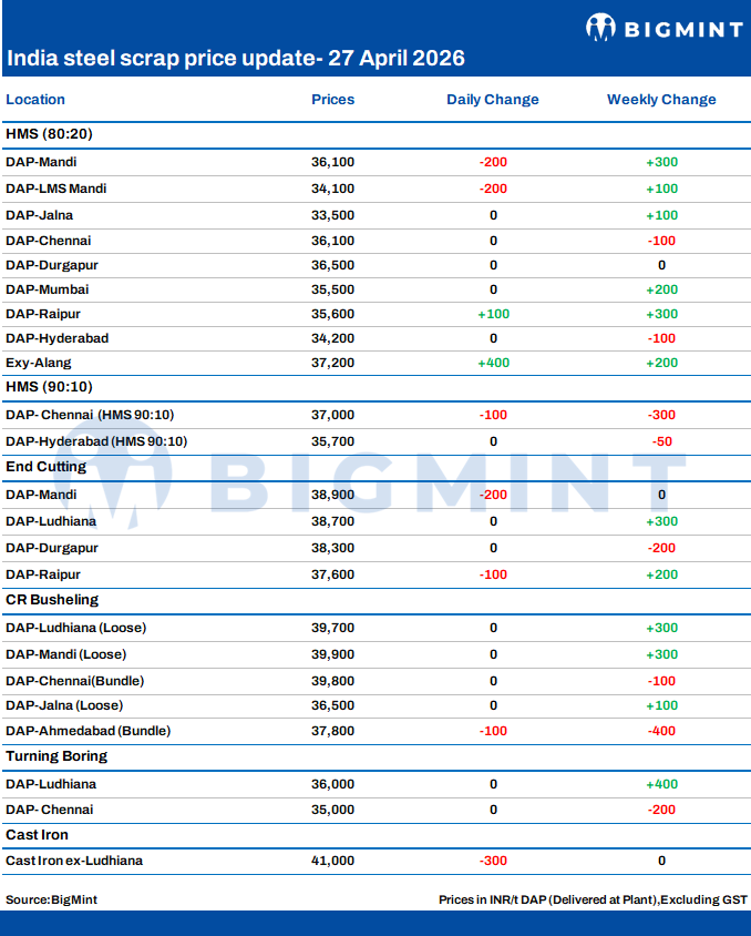 BigMint's domestic end-cutting scrap index, tracking the Mandi Gobindgarh market, dipped by INR 200/tonne (t) d-o-d to INR 38,900/t DAP on 27 April 2026. Scrap prices in the region fell by INR 200/t d-o-d.