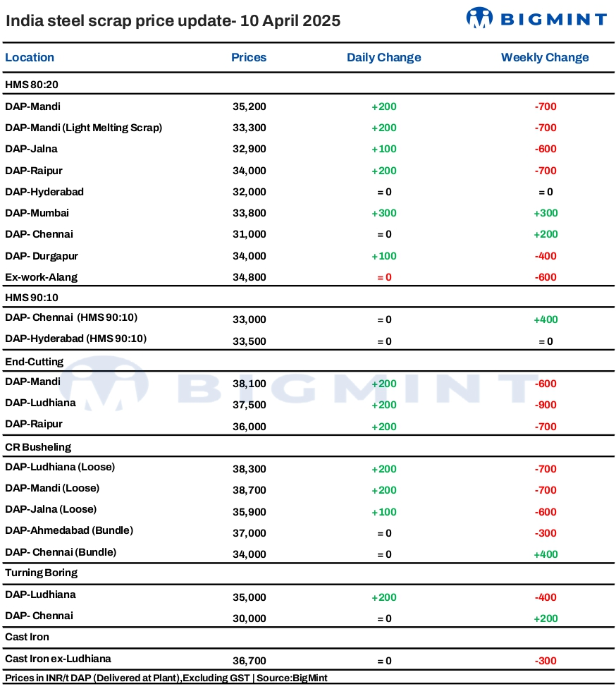 BigMint's domestic end-cutting scrap index, tracking the Mandi Gobindgarh market, increased by INR 200/t to INR 38,100/t DAP on 10 April 2025.