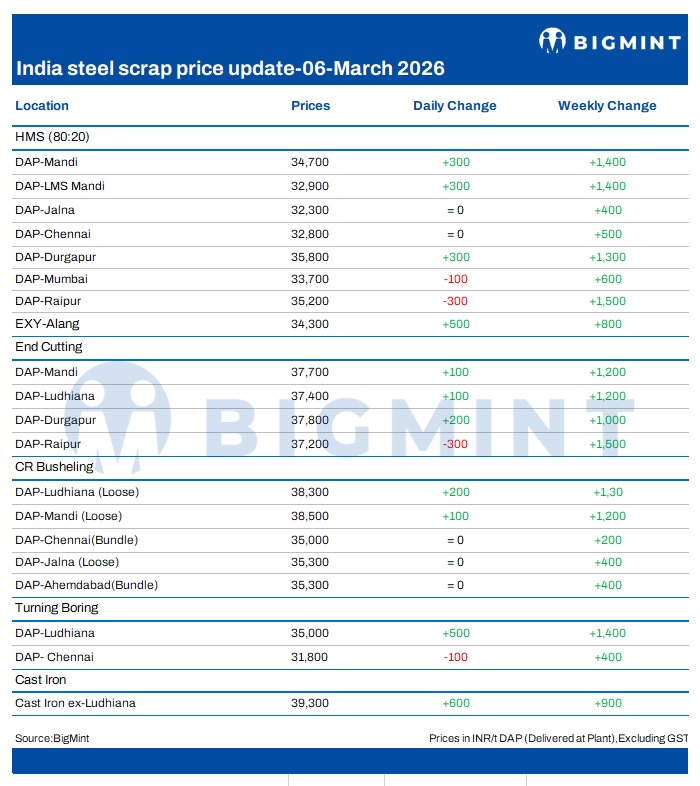 BigMint's domestic end-cutting scrap index, tracking the Mandi Gobindgarh market, increased by INR 400/tonne (t) d-o-d to INR 38,000/t DAP on 9 March 2026.Scrap prices surged INR 300-400/t today on improved demand.