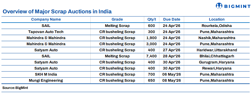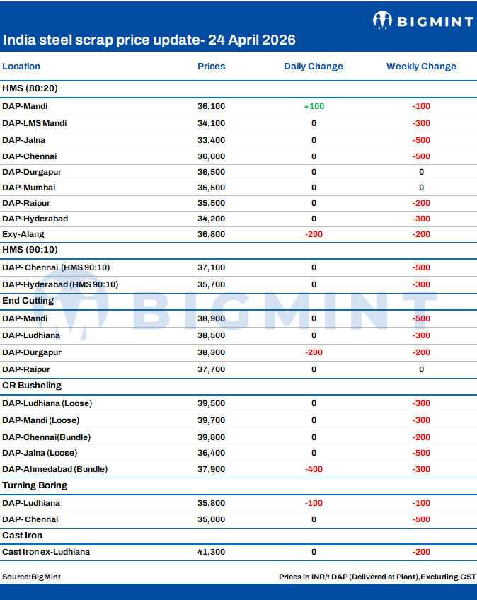 BigMint's domestic end-cutting scrap index, tracking the Mandi Gobindgarh market, remained unchanged d-o-d at INR 38,900/tonne (t) DAP on 24 April 2026.