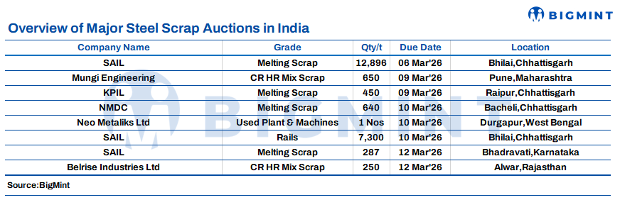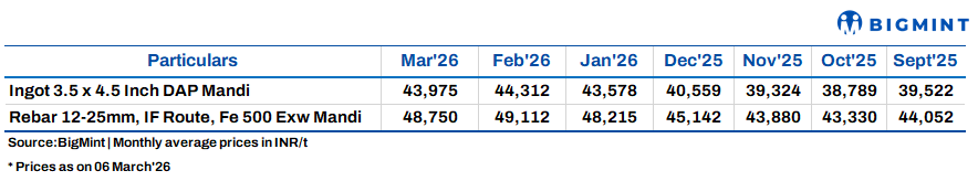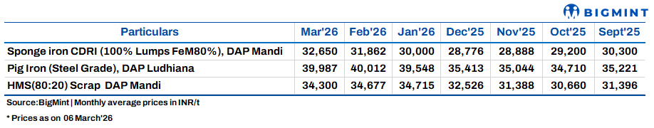 BigMint's domestic end-cutting scrap index, tracking the Mandi Gobindgarh market, inched up by INR 100/tonne (t) d-o-d to INR 37,700/t DAP on 6 March 2026.Scrap prices surged INR 735-800/t this week, fueling an overall positive market sentiment.