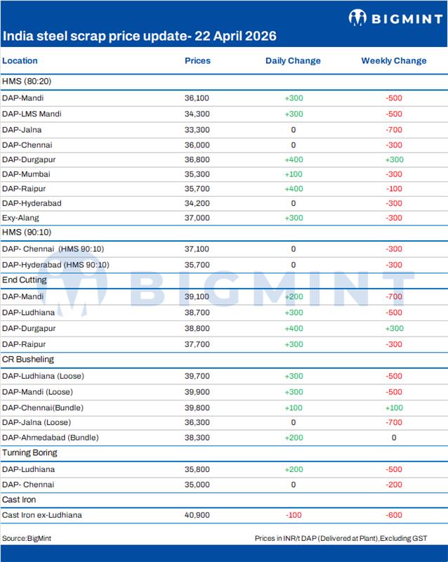 BigMint's domestic end-cutting scrap index, tracking the Mandi Gobindgarh market, increased by INR 200/t d-o-d to INR 39,100/tonne (t) DAP on 22 April 2026.