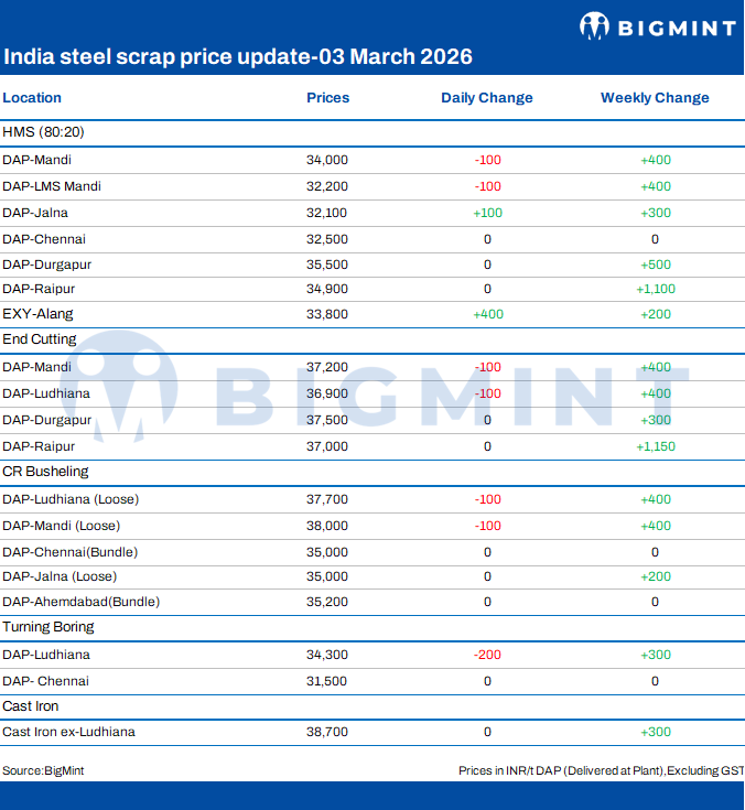 BigMint's domestic end-cutting scrap index, tracking the Mandi Gobindgarh market, dipped by INR 100/tonne (t) d-o-d to INR 37,200/t DAP on 03 March 2026. The Mandi Gobindgarh steel market witnessed a downtrend in steel prices ahead of the upcoming festival, with only needbased activity seen in trade. This subdued sentiment prompted scrap suppliers to lower their offers in todays market. Local mills, however, remain optimistic that steel prices will firm up after the festival, expecting improved demand once operations resume after the oneweek halt.