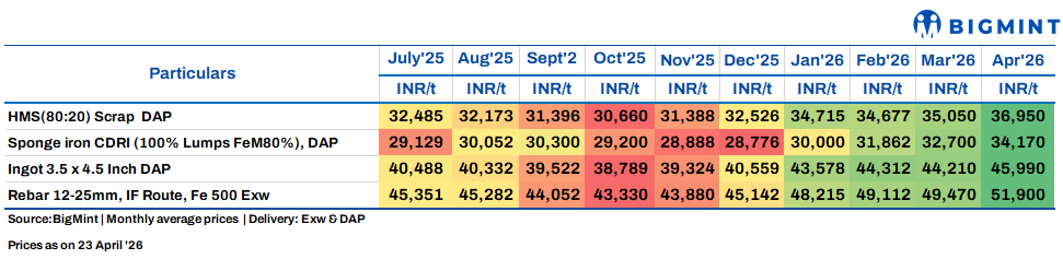 On the raw material side, HMS (80:20) scrap was assessed at INR 35,500/t DAP, with the scrap-billet conversion spread hovering around INR 9,800/t.