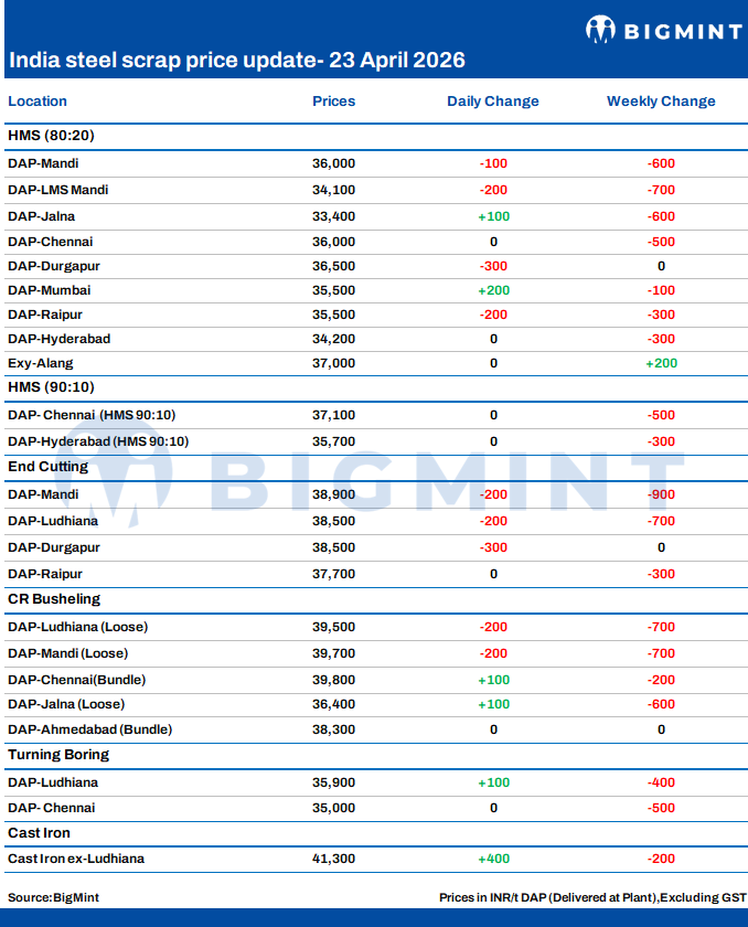 BigMint's domestic end-cutting scrap index, tracking the Mandi Gobindgarh market, softened by INR 200/tonne (t) d-o-d to INR 38,900/t DAP on 23 April 2026. Overall, scrap prices in the region declined by INR 100-200/t d-o-d.