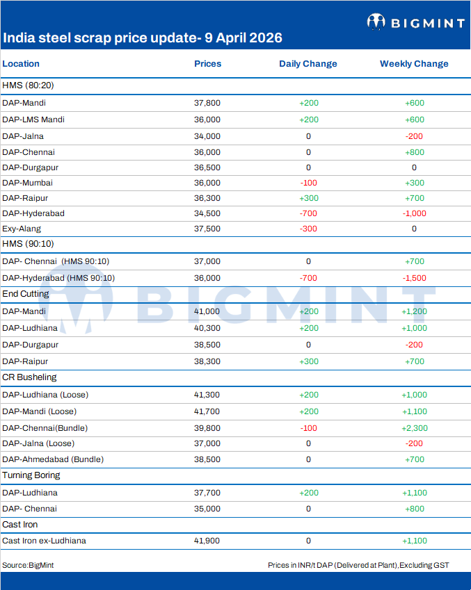 BigMint's domestic end-cutting scrap index, tracking the Mandi Gobindgarh market, increased by INR 200/tonne (t) d-o-d to INR 41,000/t DAP on 9 April 2026. The market opened on a positive note, with initial momentum supported by improved sentiment. Billet prices, which had closed at INR 46,800/t in the previous session, increased to INR 47,000/t during the first half of the day.
