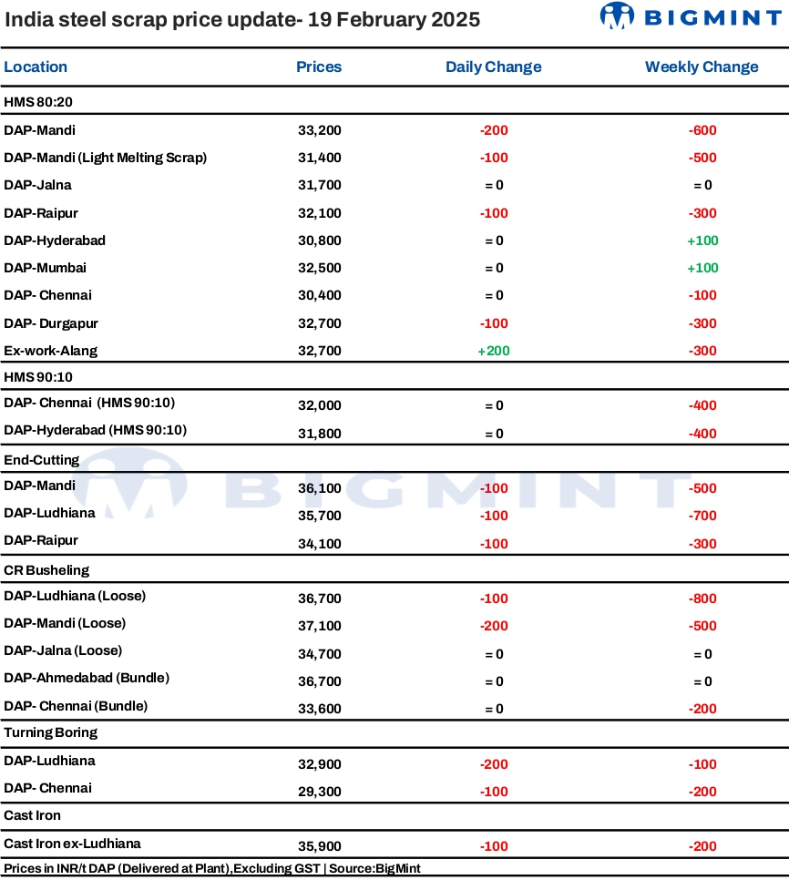 BigMint's domestic end-cutting scrap index, tracking the Mandi Gobindgarh market, declined slightly by INR 100/tonne (t) d-o-d to INR 36,100/t DAP on 19 February 2025.