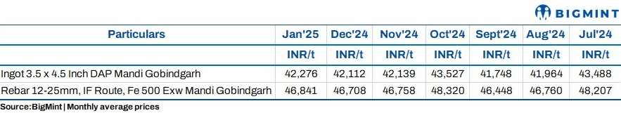In Mandi Gobindgarh, steel ingot prices saw a minor decline of INR 100/t d-o-d to INR 42,000/t DAP, while semi-finished tags in major markets decreased by INR 100-200/t compared to the previous day.
