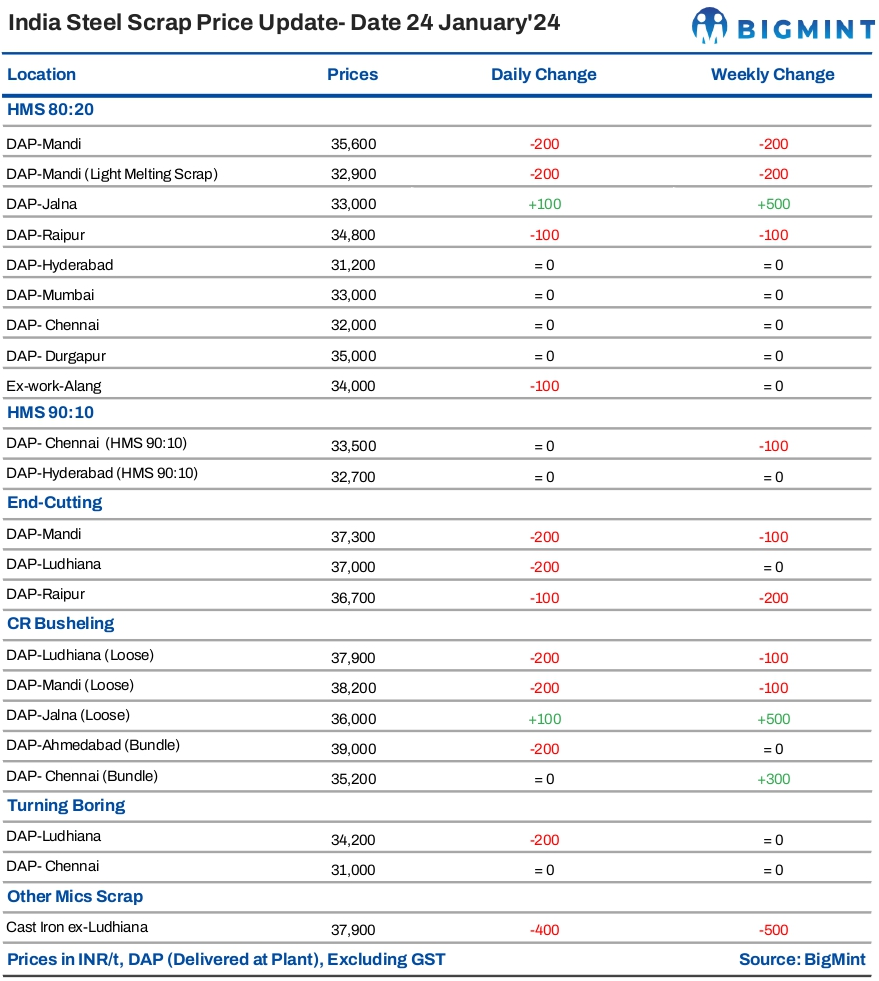 On 24 January, 2024, BigMint's domestic steel scrap (end-cutting) index recorded a decrease of INR 200/t, settling at INR 37,300/t on a delivered-at-plant (DAP) basis in Mandi Gobindgarh. In Mandi, there has been a decent arrival of scrap witnessed in the region, but due to slow trade activity, mills were procuring scrap in average volumes. Additionally, imported scrap remained impractical at the moment. A noteworthy trend was observed, with the majority of mills incorporating sponge iron into their steel-making processes. Furthermore, the winter and cold weather conditions are currently causing disruptions in daily routine work.