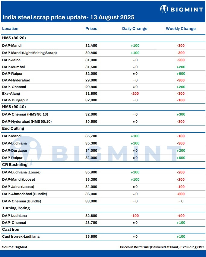 BigMint's domestic end-cutting scrap index, tracking the Mandi Gobindgarh market, inched up by INR 100/t d-o-d to INR 35,700/t DAP on 13 August 2025. The Mandi steel scrap market remained steady today, with no major price fluctuations reported. Moderate demand for semi-finished steel provided support to current prices. As a result, scrap suppliers increased their offers by INR 100/t, reflecting a measured response to stable market conditions.