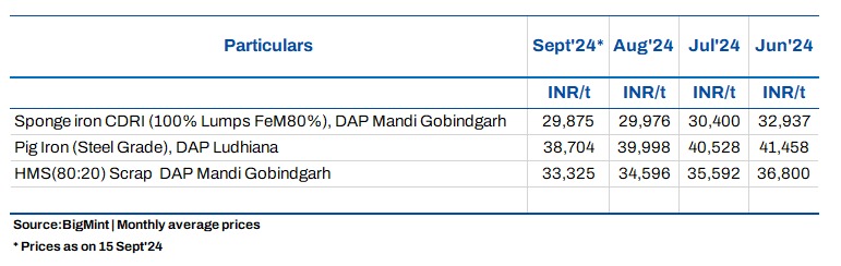 Sponge iron (CDRI) prices increased by INR 100/t to INR 29,700/t DAP in Mandi. Meanwhile, pig iron (steel grade) prices in Ludhiana increased by INR 200/t to INR 38,200/t DAP.
