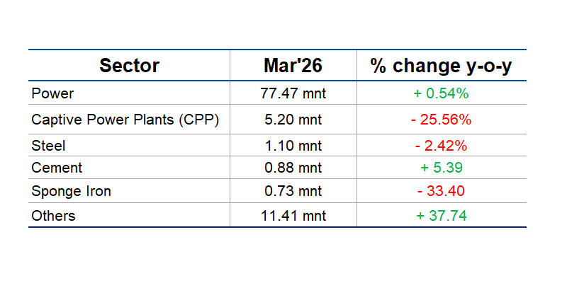 For the full fiscal year, dispatches to the power sector stood at 807.50 mnt ( -2.92% vs FY 2024-25), while dispatches to the steel sector declined by 14.86% to 15.84 mnt.
