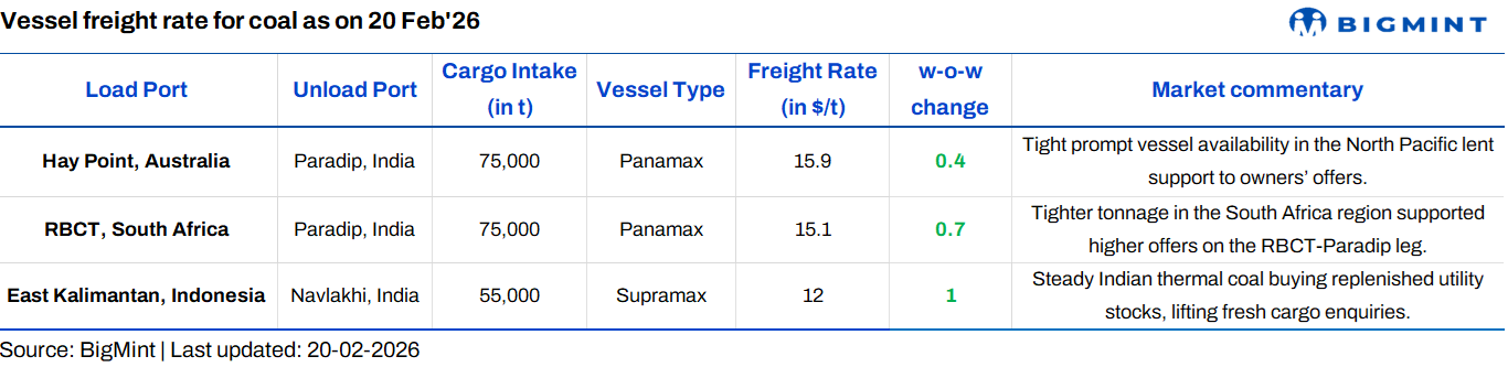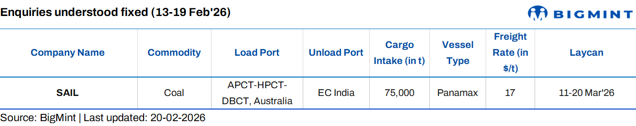 - BDI dips w-o-w; Panamax up, Supramax steady: The Baltic Dry Index fell 76 points w-o-w to 2,019 as of 19 February 2026, pressured by weaker Capesize earnings amid slower cargo activity. In contrast, the Panamax index rose 50 points to 1,160 on improved Pacific demand, while the Supramax segment edged down 5 points to 1,160 on limited fresh enquiries.