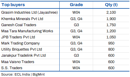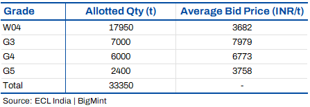 Meanwhile, W04 grade accounted for the bulk of allocations, clearing across several mines, including Dabor OC, Chapapur OC, Lakhimata UG, Badjna UG, and Shyampur B UG, mostly in the INR 3,600-4,050/t range.