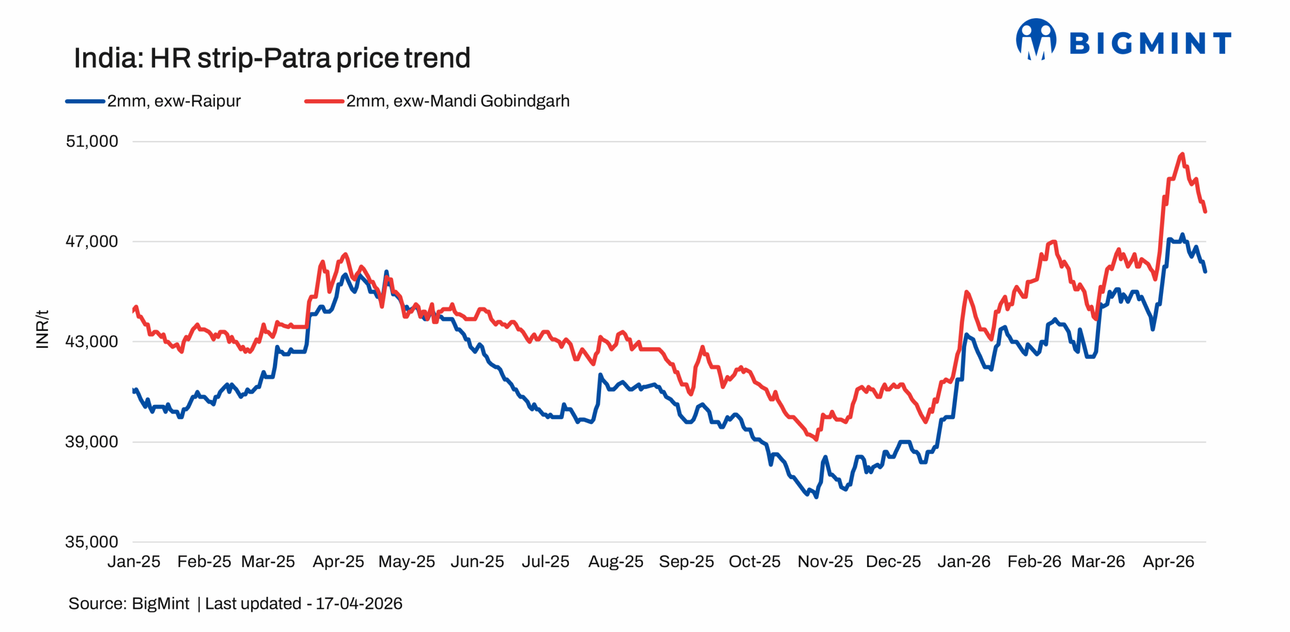 HR strip (patra): HR strip (patra) prices in Raipur dropped by INR 800/t w-o-w to INR 45,800/t exw on 17 April from INR 46,600/t exw on 10 April 2026. Similarly, patra prices in Mandi Gobindgarh declined by INR 1,300/t w-o-w to INR 48,200/t exw, down from INR 49,500/t a week earlier.