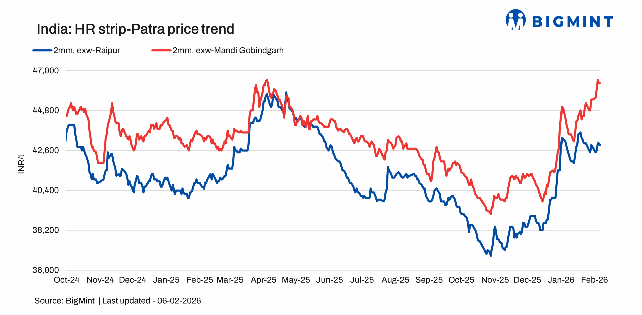 HR strip (patra): HR strip (patra) prices in Raipur inched up by INR 100/t w-o-w to INR 42,900/t exw on 6 February, compared with INR 42,800/t exw on 30 January 2026. Meanwhile, patra prices in Mandi Gobindgarh rose by INR 900/t w-o-w to INR 46,300/t exw, up from INR 45,400/t a week earlier. Trade activity during the week was recorded at around 990 t in Raipur and approximately 1,090 t in Mandi Gobindgarh.