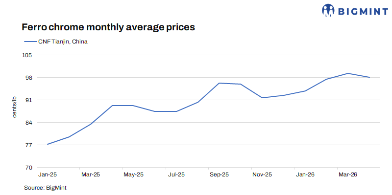 BigMint expects prices to remain under pressure next week due to subdued domestic demand. Further price trends will be determined by the bids in the latest auction by Vedanta-Ferro Alloys Corporation Ltd (FACOR) for high-carbon ferro chrome (Cr: 50-56% min, 0-150 mm), which is scheduled on 3 April 2026.
