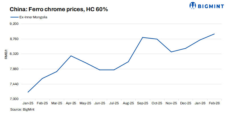 Indian high-carbon ferro chrome (HC 60%, Si: 4%) prices witnessed an increase of INR 9,600/t ($106/t) as compared to the previous assessment on 28 January 2026. Prices reached their highest point since September 2023 following high-grade material scarcity in the market and higher premiums at recent domestic auctions.