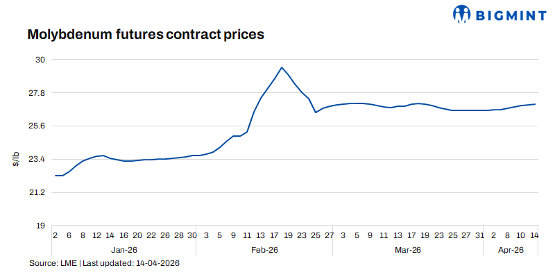 Imported molybdenum oxide (Mo: 57% min) prices in India were also stable w-o-w at $27/lb on 15 April 2026.