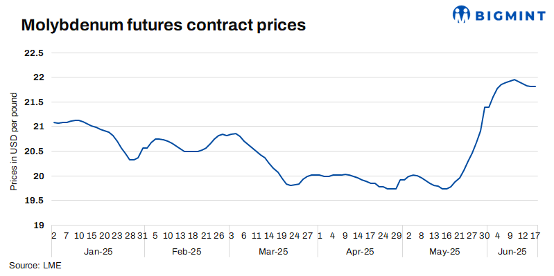 Prices on the London Metal Exchange (LME) platform, which serves as a primary benchmark for determining ferro molybdenum prices, hit $21.95/lb on 10 June, the highest-ever since November last year. Latest prices were at $21.81/lb on 17 June, largely steady w-o-w.