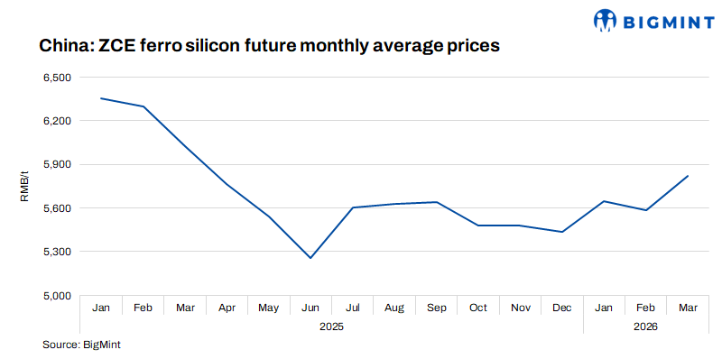ZCE futures rise w-o-w: Ferro silicon futures for May 2026 delivery on the Zhengzhou Commodity Exchange (ZCE) rose slightly by RMB 104/t ($15/t) w-o-w to RMB 5,868/t ($848/t) on 9 March 2026, compared with RMB 5,764/t ($834/t) on 2 March 2026.