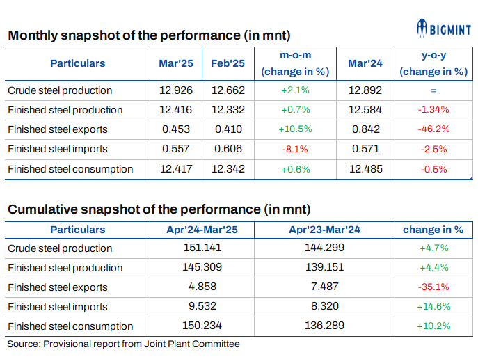 India's finished steel production increased marginally by 0.7% in March 2025 to 12.416 mnt compared to 12.332 mnt in February 2025. However, on a y-o-y basis, output edged down by 1.3% from 12.584 mnt in March 2024.