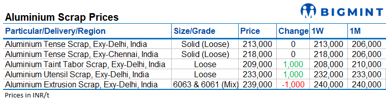 Domestically, scrap prices stayed firm, particularly for Tense scrap, amid tight availability and improving demand for ADC12 alloy. In southern regions, Tense scrap was reported to be trading at premiums, with a southern alloy manufacturer indicating offers in the range of INR 217,000-220,000/t ex-Chennai.