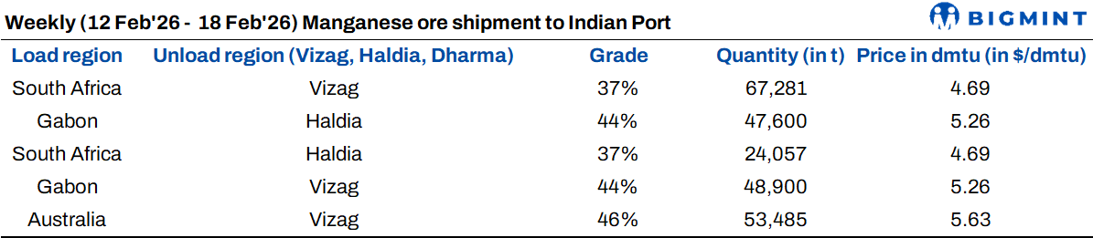 Imported manganese ore cargo arrivals rise: Weekly manganese ore cargo arrivals (Mn37%, Mn44%, and Mn46%) to India increased by 55% to 242,313 t over 12-18 February 2026 against 156,738 t in the previous week.