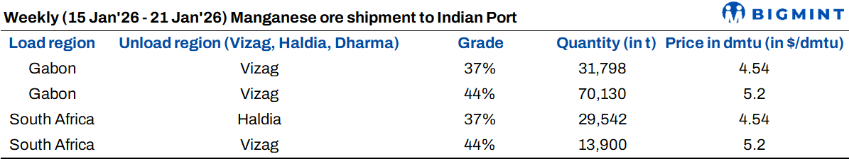 Imported manganese ore cargo arrivals down w-o-w: Weekly manganese ore cargo arrivals (Mn37%, Mn44%, and Mn46%) to India fell by 6% to 145,370 t over 15-21 January 2026 against 154,611 t in the previous week.