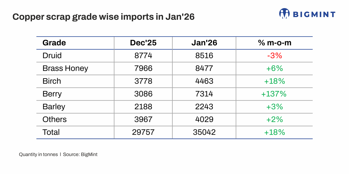India's copper scrap imports surged 15% m-o-m in January 2026 to 35,042 tonnes (t) from 29,750 t in December 2025, as per BigMint data. This was despite a sharp 11% m-o-m uptick in copper prices, from $11,800/t in December 2025 to $13,070/t in January 2026, driven by improved global demand after the year-end slowdown.