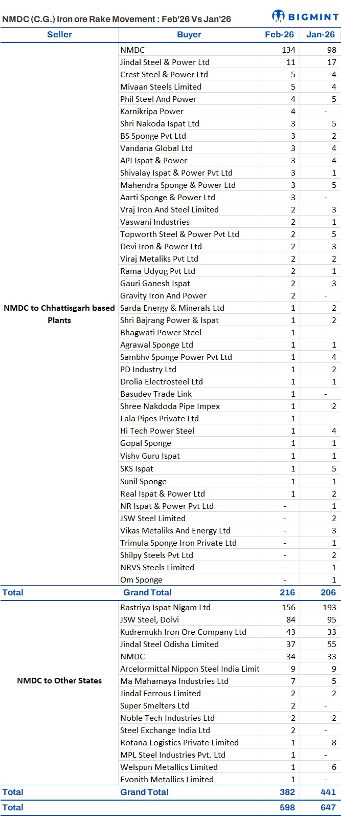NMDCs rake movements softened in February despite higher dispatches to its Nagarnar plant. The decline was mainly due to reduced sourcing by plants in other states and lower lifting by Chhattisgarh-based mills (excluding NMDC). However, several plants taking alternative iron ore markets offering also.